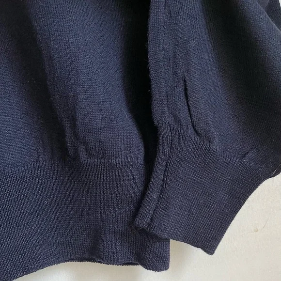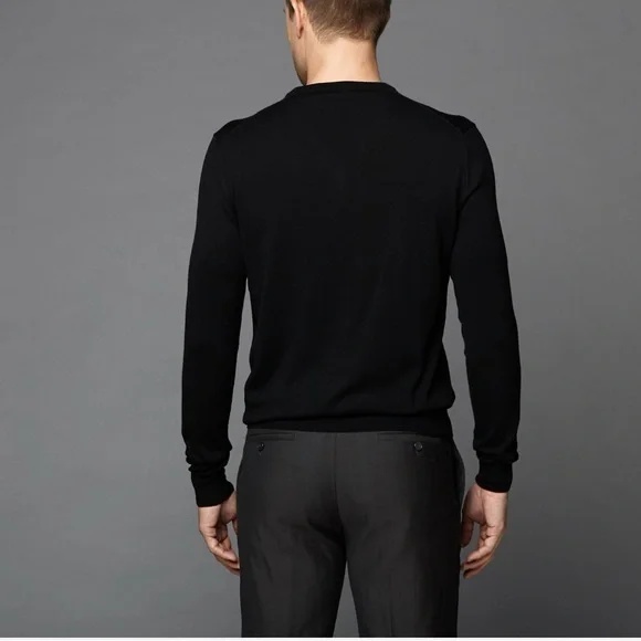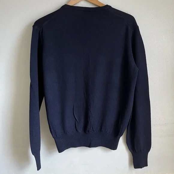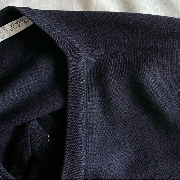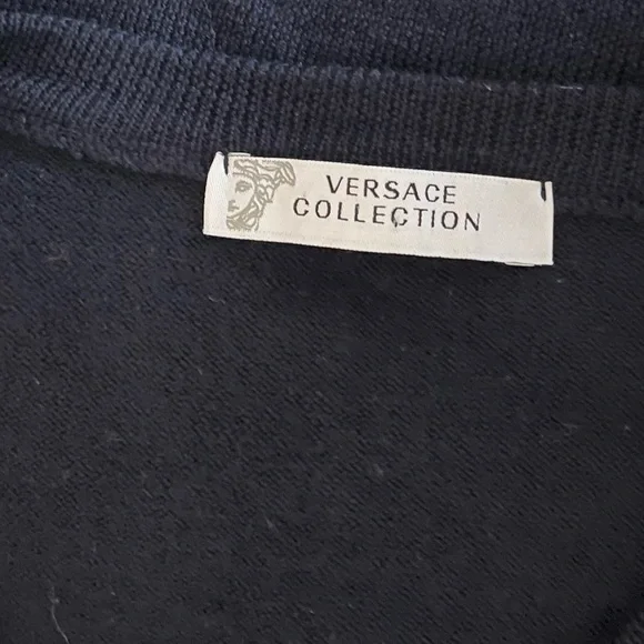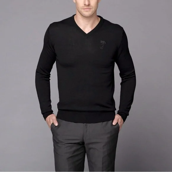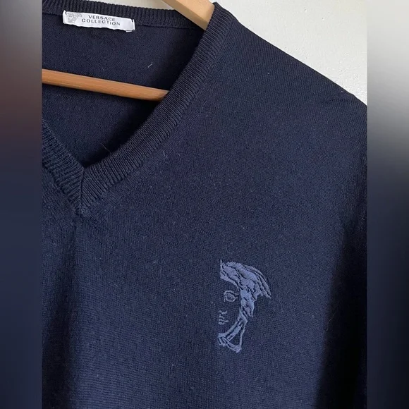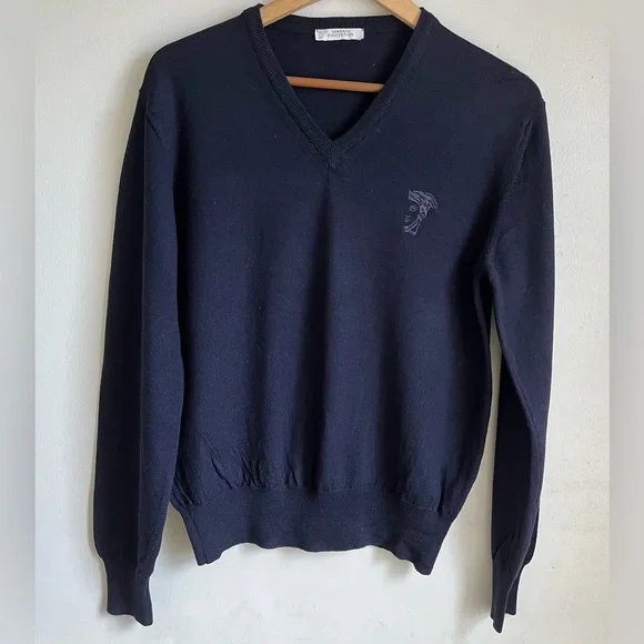 This Versace sweater is the perfect essential for business lunches and casual brunches. The pullover's half Medusa face embroidery on the chest makes it a clear-cut designer piece, while fine ribbing of the cuffs and hem helps it hold a slim, flattering shape.* With code to check authenticity. * Has small repair at the shoulder ( see picture).Pit to pit 20”( stretch), length 25”, approx.
